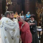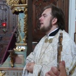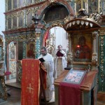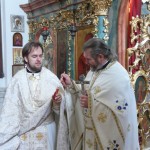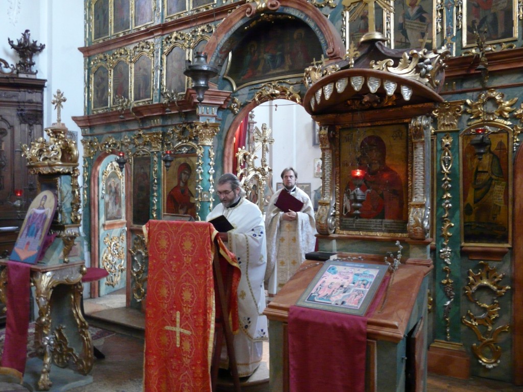 A különleges belső szépségű templomban magyar, egyházi szláv és szlovák nyelven hangzottak fel egyházunk ősi imái és énekei. István atya prédikációjában az Úr dicsőséges mennybemeneteléről és a tanítványoknak szóló, a Szentlélek eljöveteléről szóló krisztusi ígéretről beszélt, majd megköszönte Miroslav atyának és híveinek a testvéri együttlét ajándékát. Válaszában a vendéglátó parochus atya őszinte örömét fejezte ki a látogatás kapcsán, majd a 2013. esztendő kiemelkedő, Szent Cirillhez és Metódhoz, a szlávok apostolaihoz kapcsolódó jubileumáról beszélt, akik elhozták a szláv népeknek a krisztusi hit igazságát, és elvezették őket az európai keresztény nemzetek nagy családjába. A parochus atya emlékként egy olyan ikont ajándékozott a budapesti Nagyboldogasszony templomnak, amely Cirill és Metód Morvaországba érkezését, és Szent Rasztiszláv fejedelemmel és népével történt első találkozását örökíti meg, amely 863-ban volt.